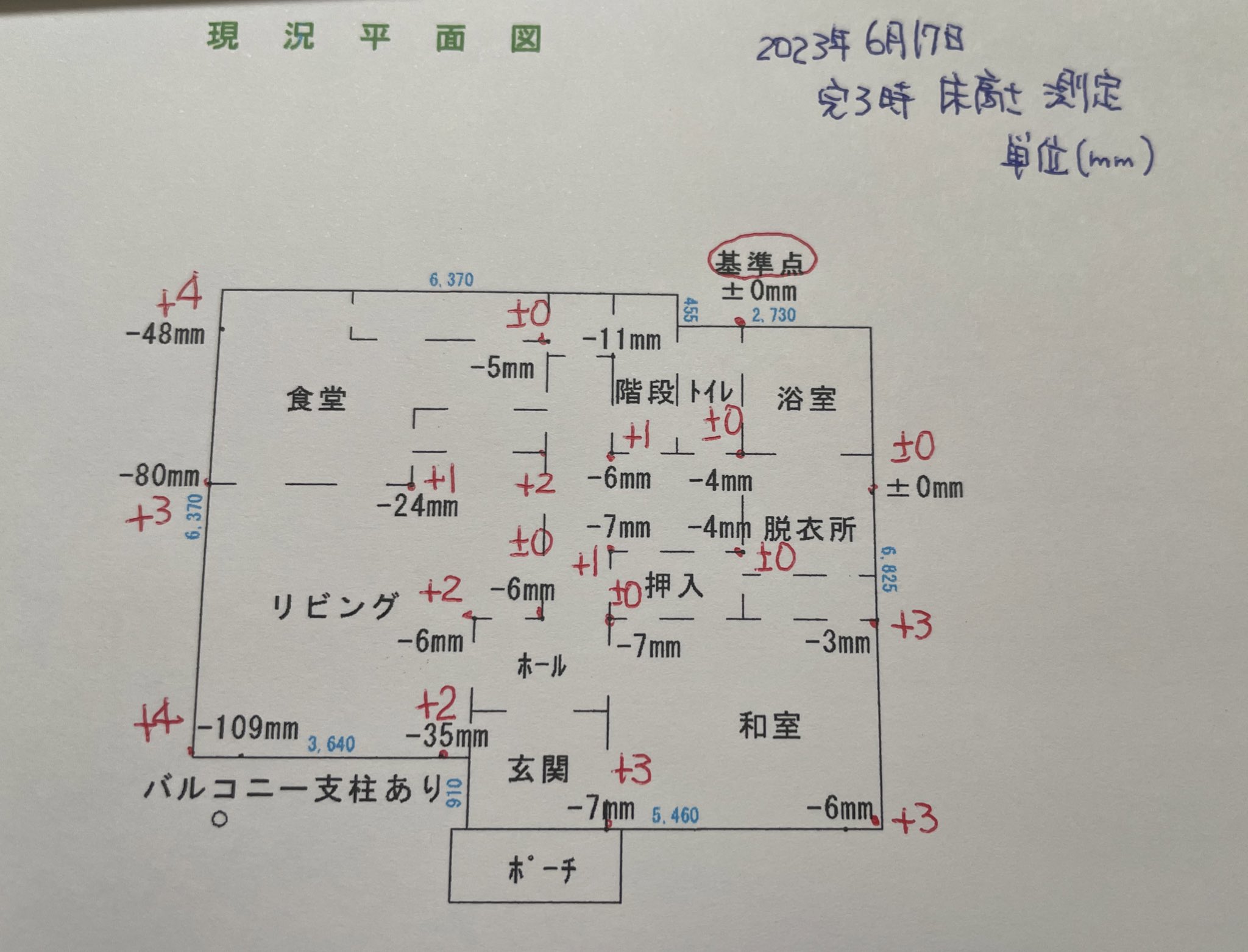 沈下修正班です 現在、小田原市内の戸建の建物の傾斜修正は無事終了しました。 仕上がり床高さを確認しましたが、基準点±0mm〜+4mmの誤差に仕上がりました。新築以上の出来栄えです。 この精度は弊社のハイブリッド工法だから出せる技です。 10年間の再沈下保証も付いてますので安心です。 -2023.6.22-